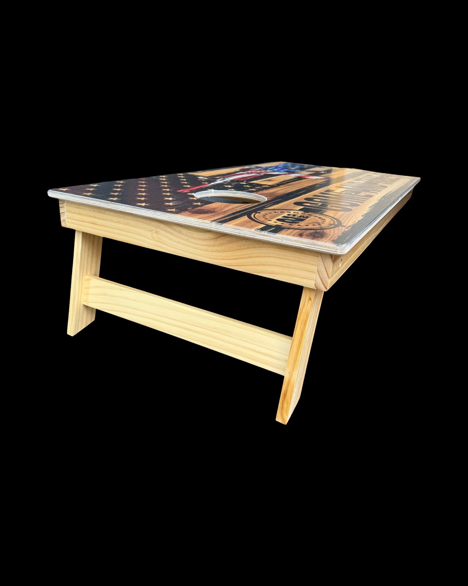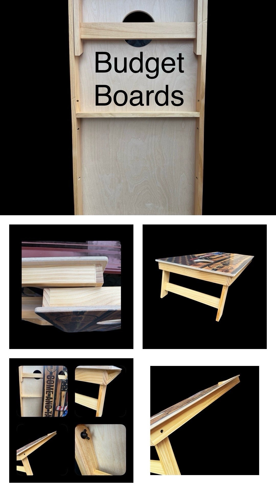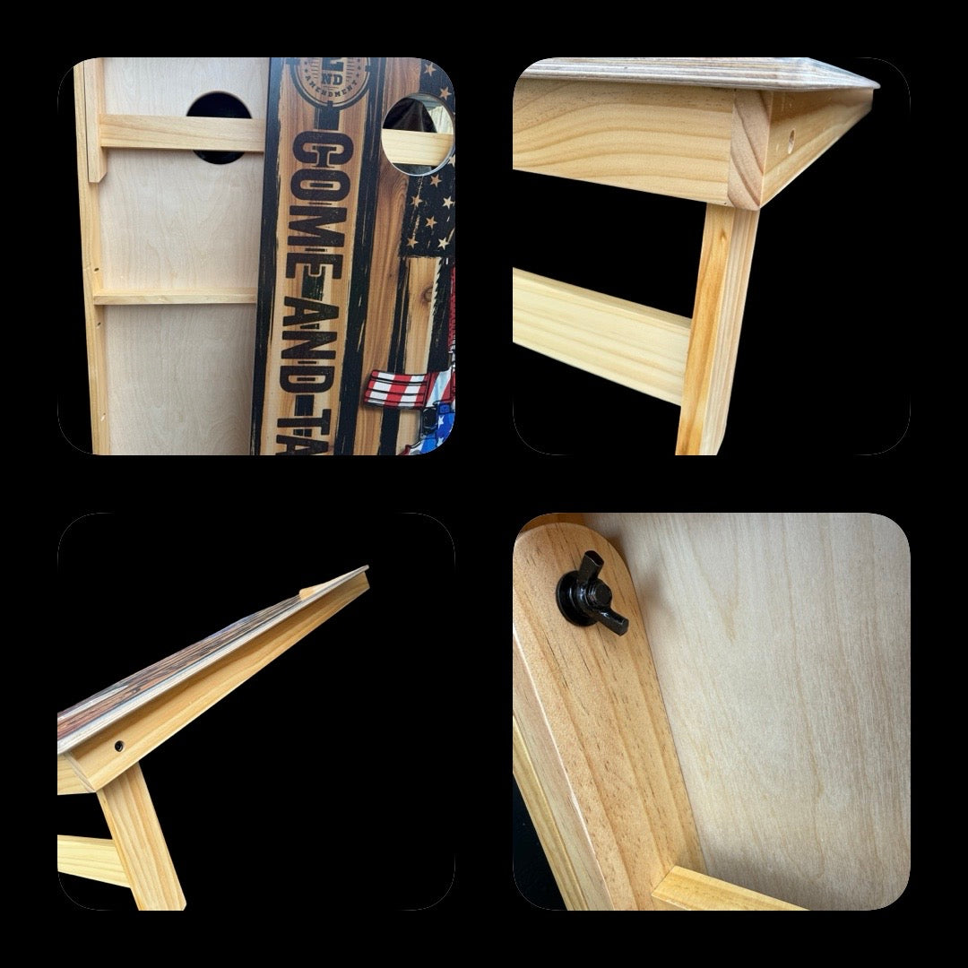 We now have a cheaper option to our pro build sets of Cornhole boards. This set is still a high quality build. Direct print image. No stickers Tops are 5/8 inch Baltic birch and frames are made of pine. They are built to the industry standard 24x48 with a 6 inch hole.