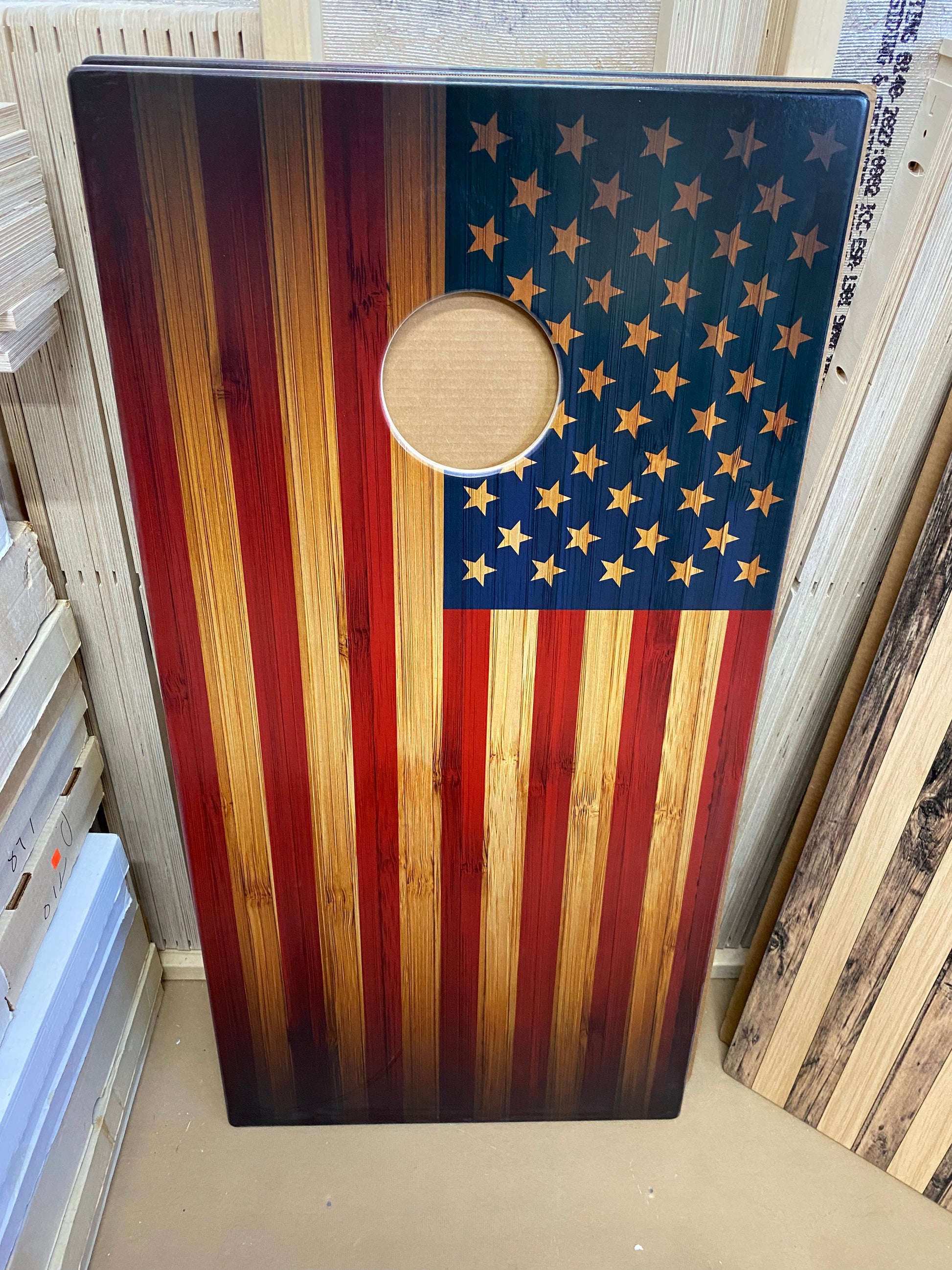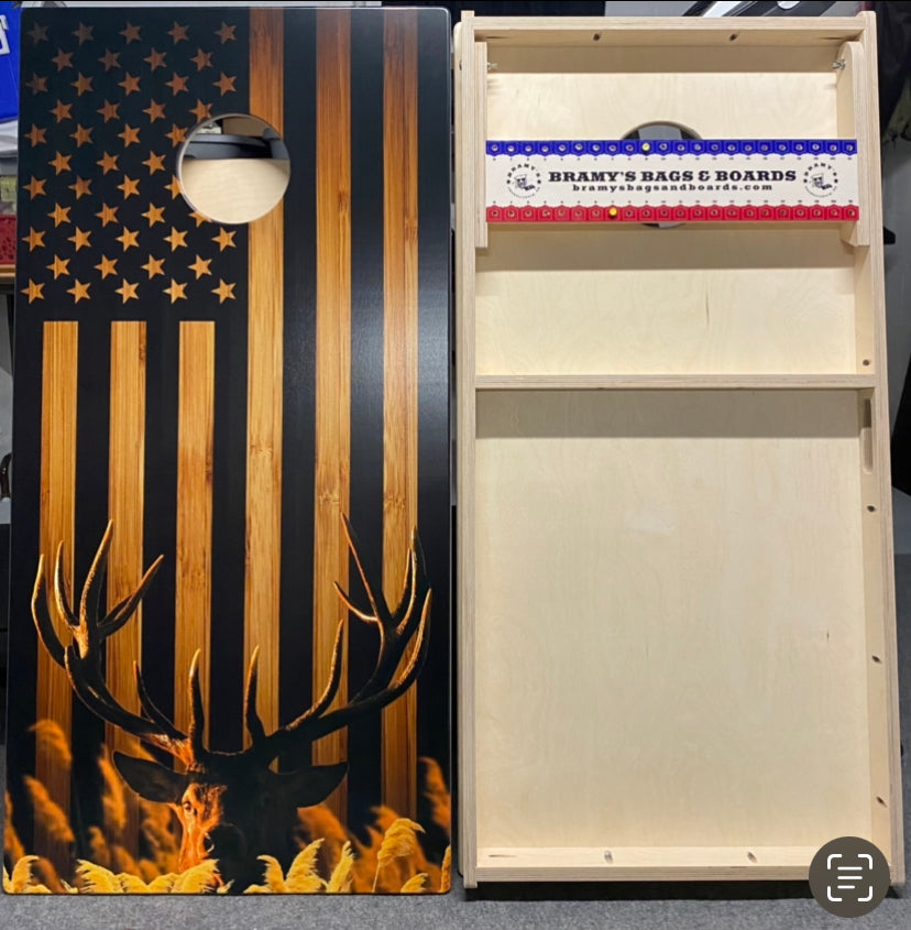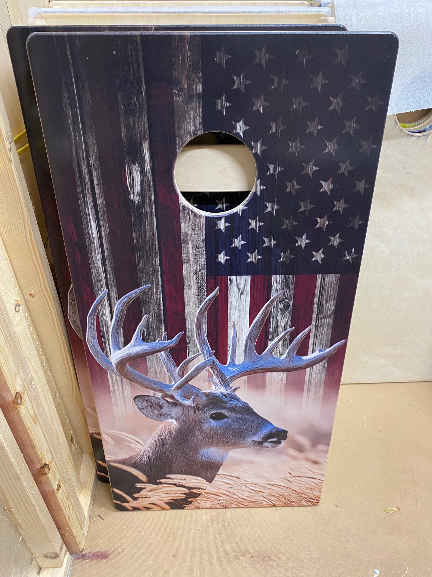 Our cornhole boards are made with the finest Baltic Birch or Birch wood, sturdy materials, 3/4 inch tops, and are regulation size. The boards have 3/4 inch legs that fold in for easy storage and built-in handles. Our Custom Design boards are direct-printed with your artwork, design, or even a picture! We will work with our designer to make your vision come to life. Order yours today!