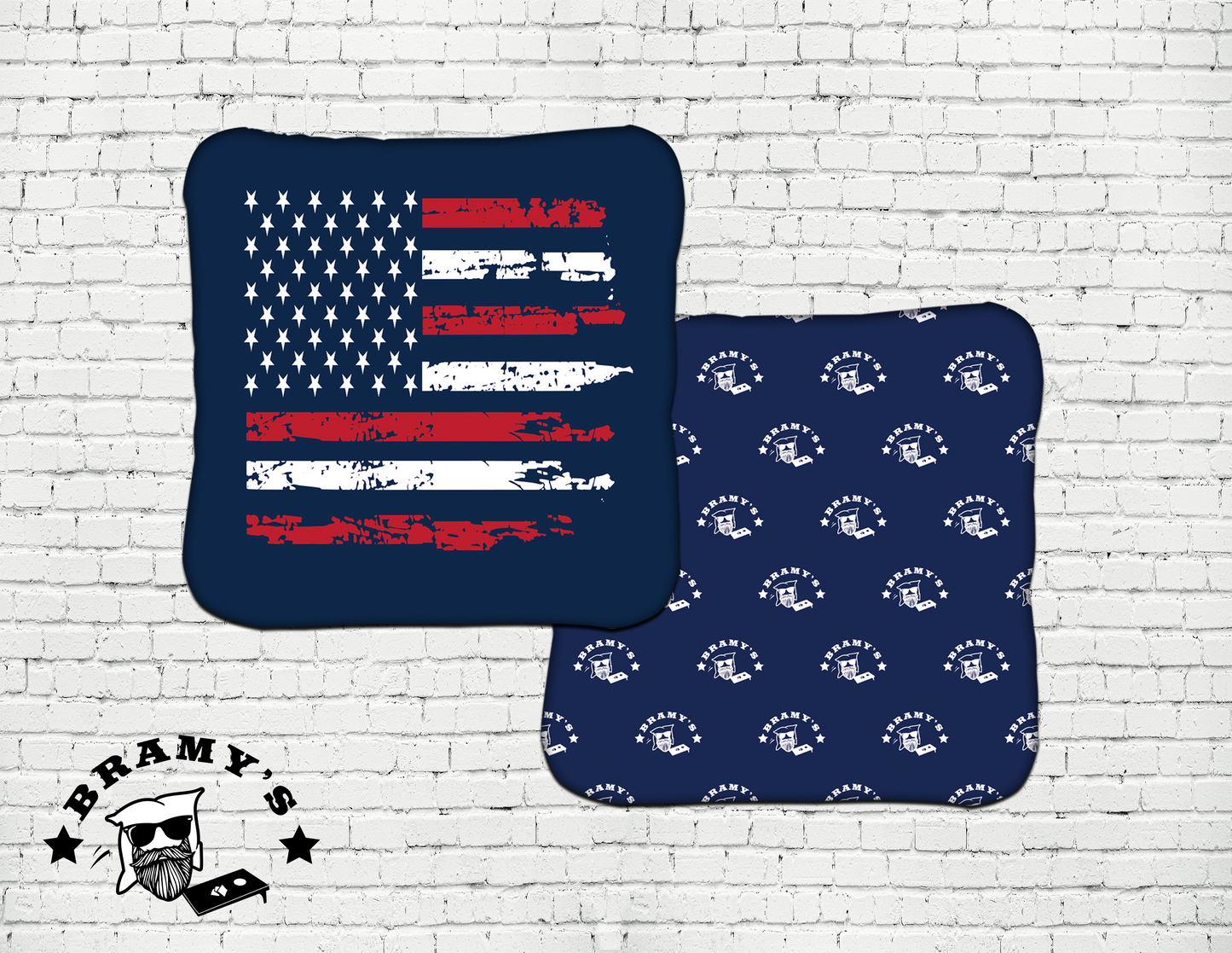 Our 'Merica Flag Bags have been designed, created, and handmade completely by Bramy's. All of these bags are filled with pro-resin and made with a durable poly weave/ carpet material. The bags have a triple-stitched closure for added quality and durability. They meet ACA standards, but are not stamped.